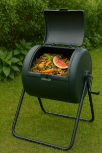 A compost tumbler is a closed container that spins or rotates, mixing materials for faster composting. Perfect if you want a more hands-off and odor-free option.